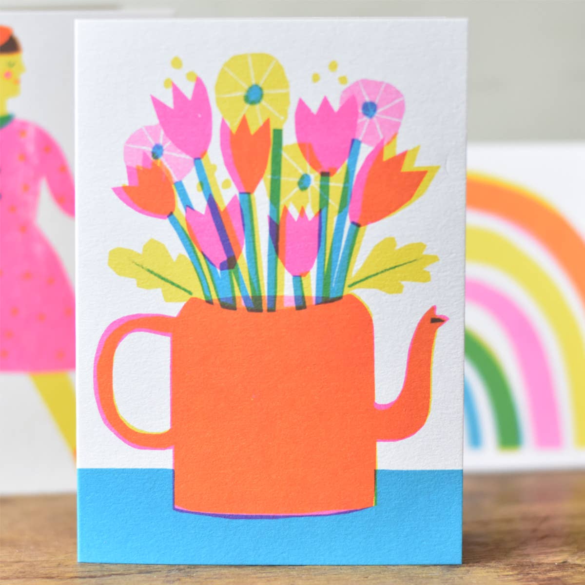 Printed by offset-lithography with a spot pink neon ink to make it extra zingy. Made in the UK from sustainably sourced card, with a 100% recycled envelope and packed in a biodegradable cello bag.